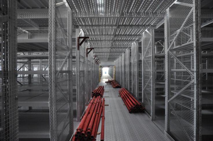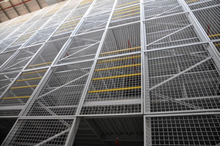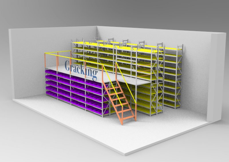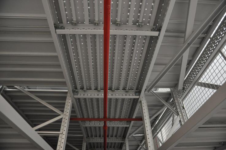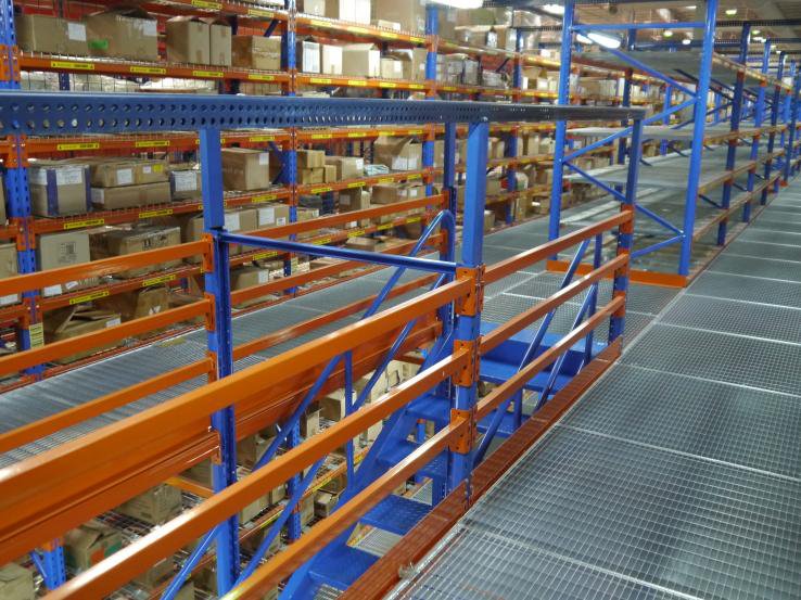 閣樓貨架系統,通常利用中型擱板式貨架或重型擱板式貨架作為主體支撐加上樓面板(根據貨架單元的總負載重量來決定選用何種貨架),樓面板通常選用冷軋型鋼樓板、花紋鋼樓板或鋼格柵樓板。近幾年多使用冷軋型鋼樓板,它具有承載能力強、整體性好、承載均勻性好、精度高、表面平整、易鎖定等優勢.有多種類型可選,并且易匹配照明系統,存取、管理均較為方便。單元貨架每層載重量通常在500kg以內,樓層間距通常為2.2m~2.7m,頂層貨架高度一般為2m左右,充分考慮工作人員操作的便利性。