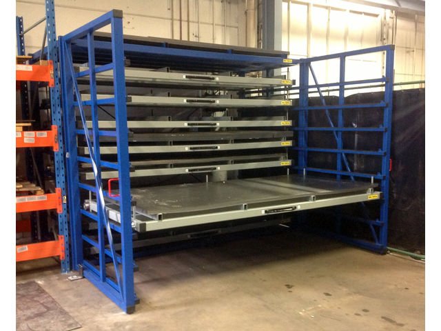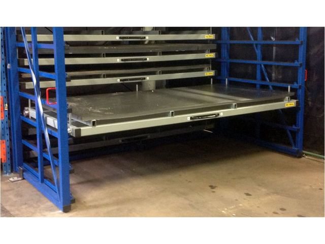 大型板材存放貨架帶有自動移動框的移動式貨架緊湊,方便定位金屬板位置,移動框架帶有滑輪和搖臂,選好目標板材之后移動懸臂即可創造空間獲取板材。移動框架固定在兩條平行軌道上,通過移動框架,人員方可進入空擋獲取金屬板是一種簡單安全的搬運方法。